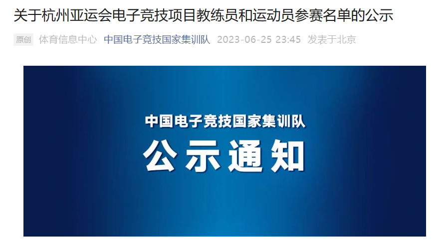 官方公告称,根据《杭州亚运会电子竞技国家队选拔方案》及《杭州亚运会电子竞技项目参赛人员推荐方案》,各相关版权方于 2023 年 3 月 30 日至 6 月 9 日期间,开展了杭州亚运会教练员和运动员的推荐工作。共有 27 名教练员报名参加选拔,其中 5 名教练员最终入选;共有 125 名运动员报名参加了选拔,其中 31 名运动员最终入选。根据各版权方推荐结果,现对最终入选教练员和运动员名单进行公示。