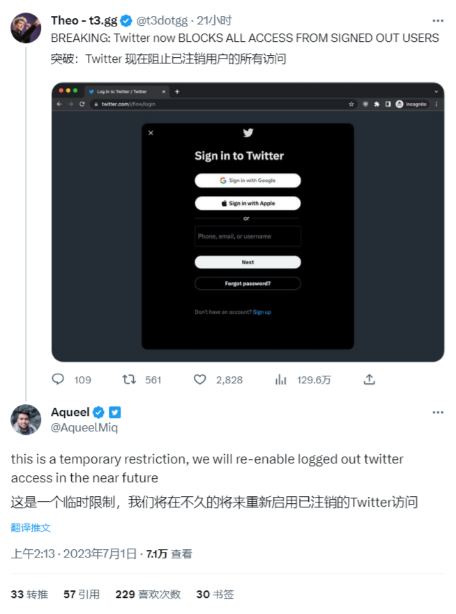 推特软件工程师 Aqueel Miqdad 发布推文:“这是临时限制,我们将在不久的将来,重新开放未登录用户访问推特”。