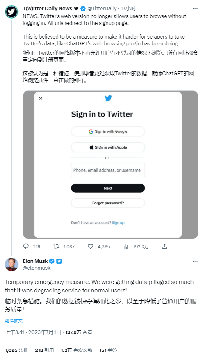 马斯克随后表示这是一项“临时紧急措施”,IT之家翻译他的评论推文内容如下:“我们的数据被爬取掠夺得太厉害了,无奈临时影响了普通用户的服务水平”。