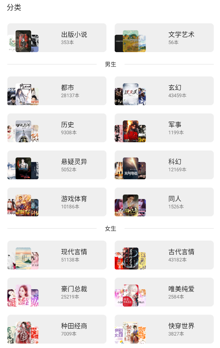分类也是很齐全,像:都市、玄幻、历史、军事、言情、总裁、科幻、同人等等,绝对可以满足你的需求。