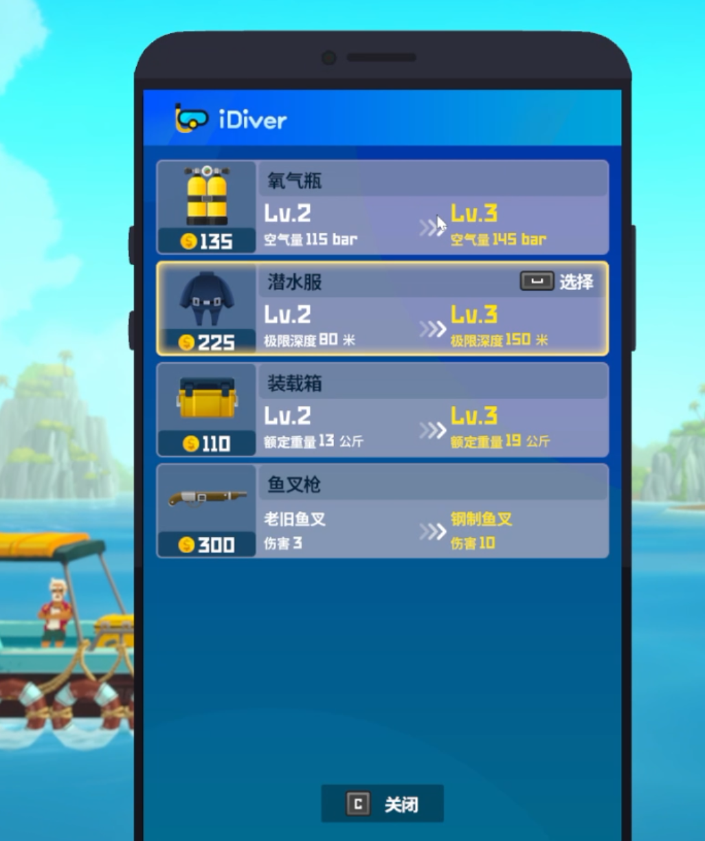 当然是升级自己的潜水装备,比如:氧气瓶、潜水服、装载箱和武器。