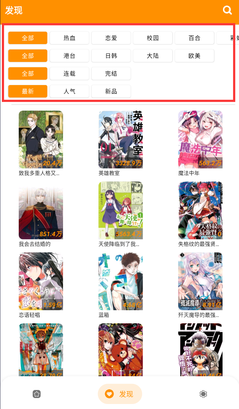在【发现】页面,这边给大家弄了一个分类功能,我们可以根据漫画的类型、地区、是否完结、人气等等去筛选到自己喜欢的漫画作品。