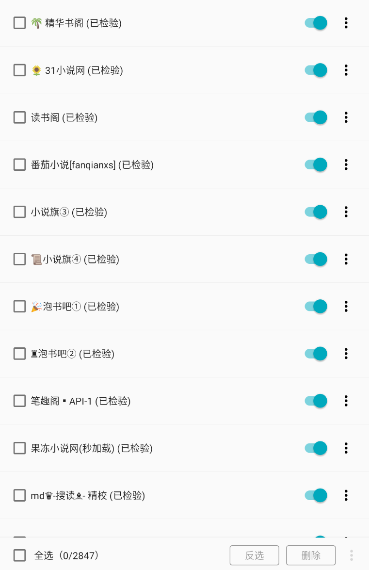 而且呢每条书源都是官方检验好的,在书源后面都给我标注出来了,如果说有你不喜欢的书源,我们可以在这边关闭,这样搜索的时候就搜索不到这个书源的资源啦。