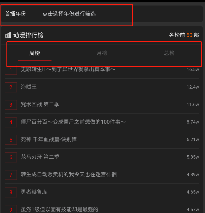这边还有一个【排行榜】页面,我们可以根据周榜、月榜、总榜单看一看有没有自己喜欢的动漫。