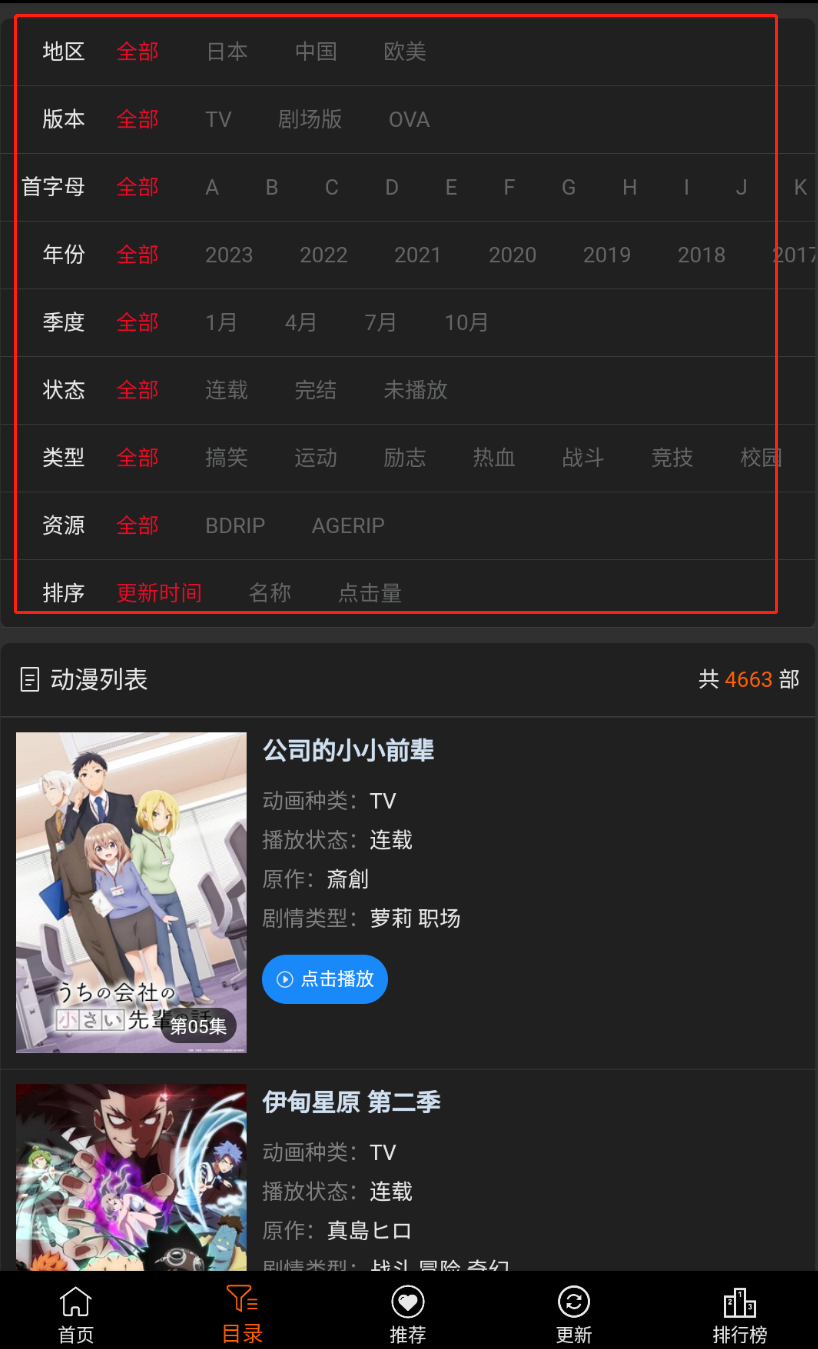 我们呢还可以在【目录】页面,根据:动漫地区、版本、首字母、年份、状态、类型等等去筛选到一个自己喜欢的动漫作品。