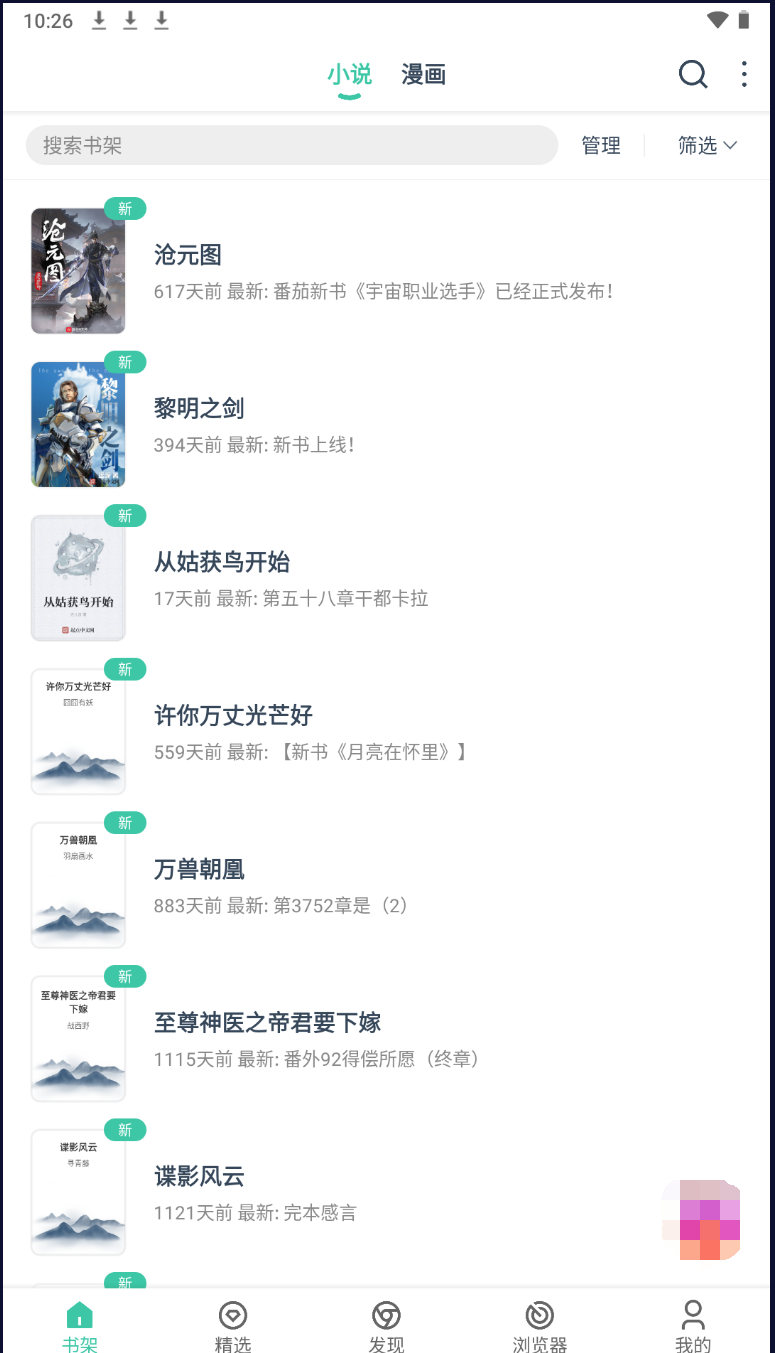 这是一个支持免费看小说和漫画的软件,其实呢说实话大家看这个界面是不是很眼熟,我也觉得眼熟,可能这些软件呢都是套的同一个源码壳子吧哈哈哈。不过我们不需要想这些,软件好不好用才是基础嘛,这个软件有广告,但不是那种恶心的视频广告,偶尔弹窗我还能接受的。