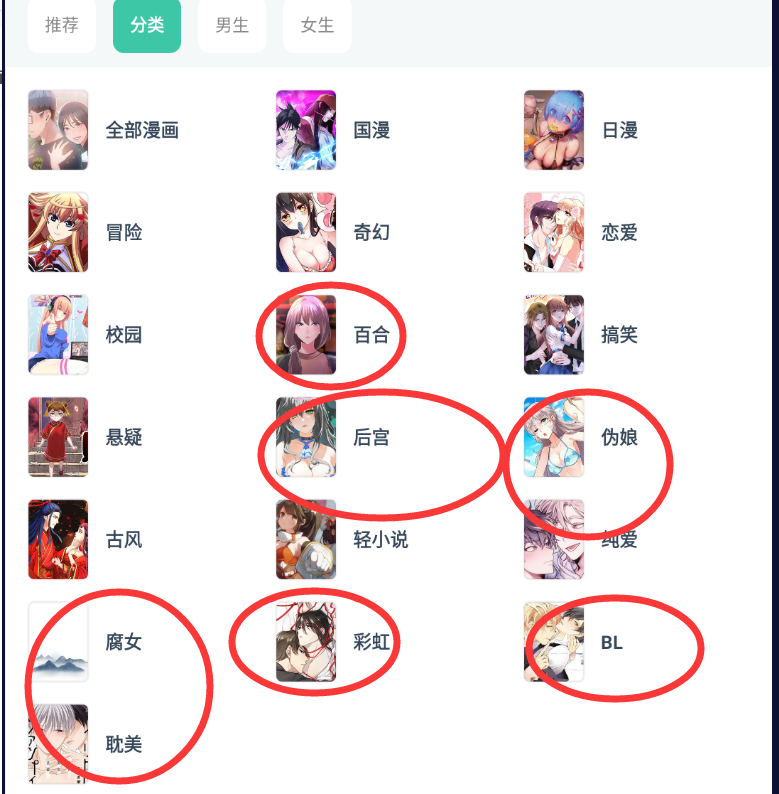 嘿嘿嘿嘿,看看长青还发现了什么好康的分类,什么:后宫、BL、伪娘、腐女、彩虹等等,还…..还…挺齐全的哈!