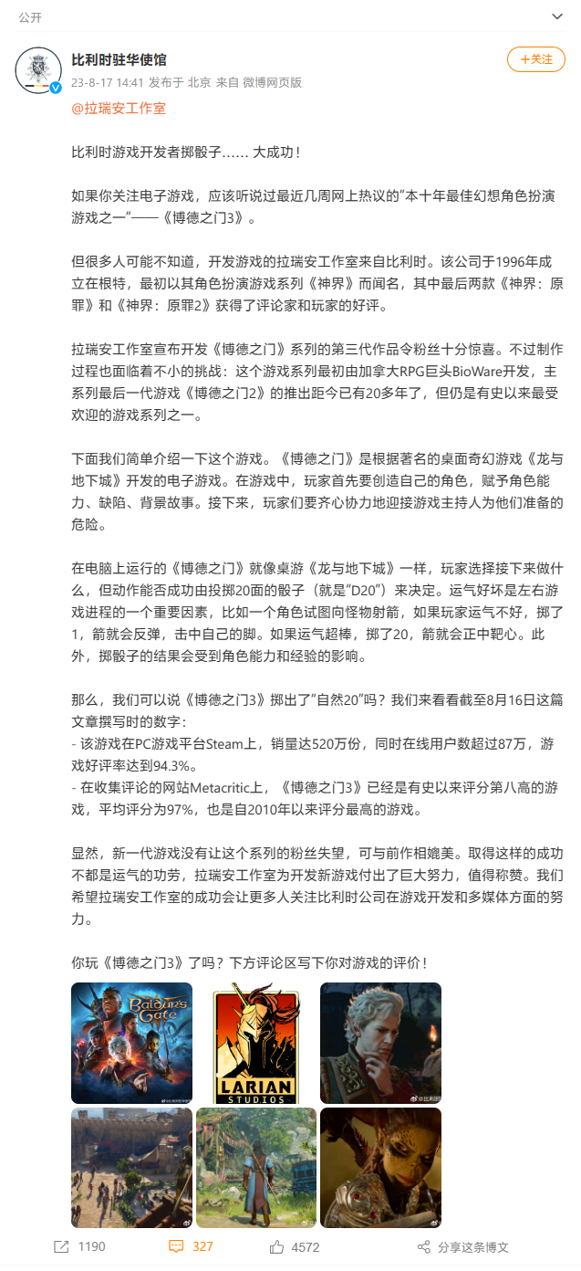 据比利时驻华使馆微博 8 月 17 日宣布,截至 8 月 16 日,“本十年最佳幻想类角色扮演游戏之一”《博德之门 3》已经达成如下成就: