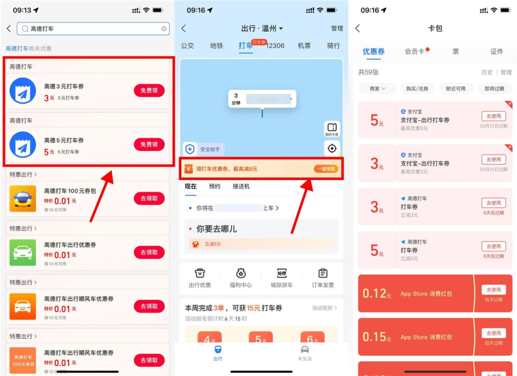 支付宝搜索“消费券”进入,再搜索“高德打车”领5+3元打车券->支付宝首页“出行”进入,打车的地图下方领5+3元打车券->出行券和打车券可以叠加使用