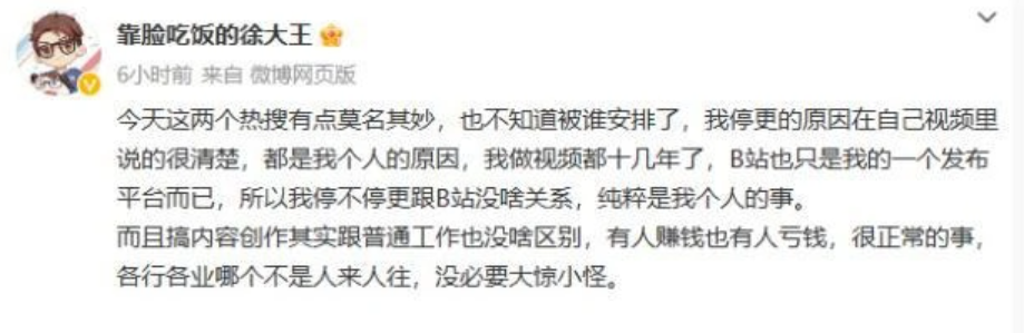 注意到,目前已有多名 UP 主对此事做出回应。游戏区博主 UP 主靠脸吃饭的徐大王发布微博表示,自己停更属于个人原因,B站也只是自己的一个发布平台而已,停不停更与B站无关。