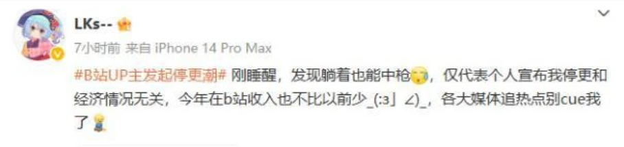 此外,在近日宣布停更的-LKS-也在微博表示,“仅代表个人宣布我停更和经济情况无关,今年在 b 站收入也不比以前少”。