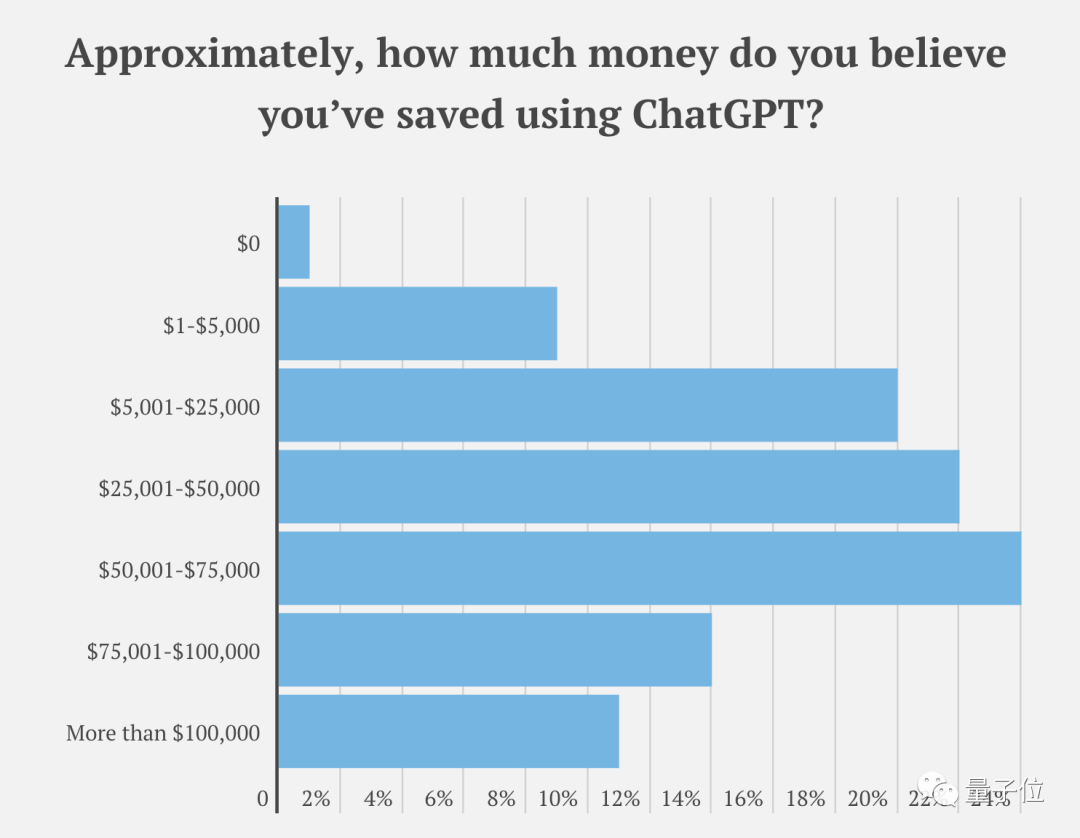 在使用 ChatGPT 的公司中,有 99% 的都称已成功节省了资金。其实,48% 的公司已经省下了 5 万美元(约合人民币 34.7 万元)以上,而 11% 的公司甚至省下了 10 万美元(约合人民币 69.4 万元)以上。