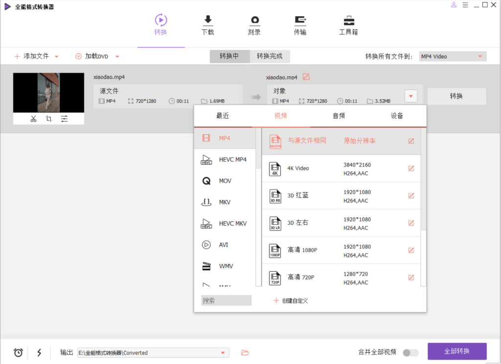 - 输出视频无水印、高速转换、批量转换、硬件加速等功能