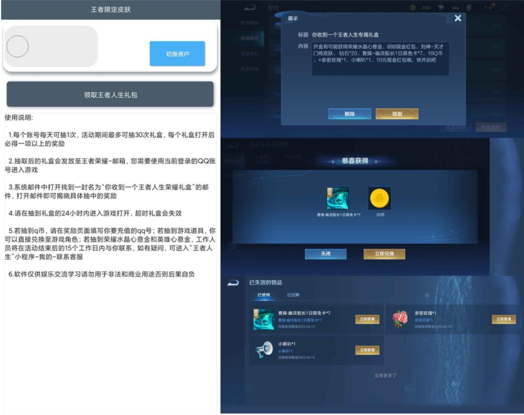 王者限定皮肤APP支持每天1次抽皮肤,最多30次,必得一项礼盒奖励,必中皮肤,有几率爆永久绝版皮肤、小喇叭、红包、荣耀水晶心意金等。