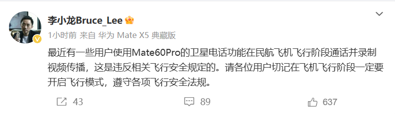 然而,由于这一功能刚刚走入大众生活,因此出现了一些使用乱象。今日上午,华为终端 BG CTO 李小龙发微博称:“最近有一些用户使用 Mate 60 Pro 的卫星电话功能在民航飞机飞行阶段通话并录制视频传播,这是违反相关飞行安全规定的。请各位用户切记在飞机飞行阶段一定要开启飞行模式,遵守各项飞行安全法规。”