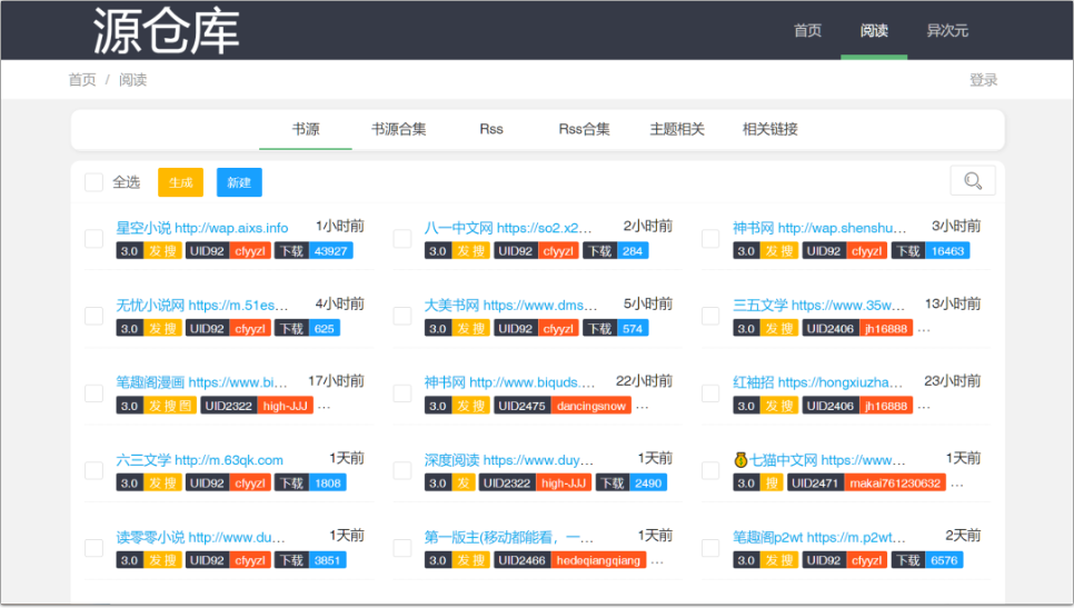 这个网站呢也是老牌的源网站了,打开首页呢我们就可以看到一些源的更新时间。这里面呢不仅有小说源,还有不少的漫画源。