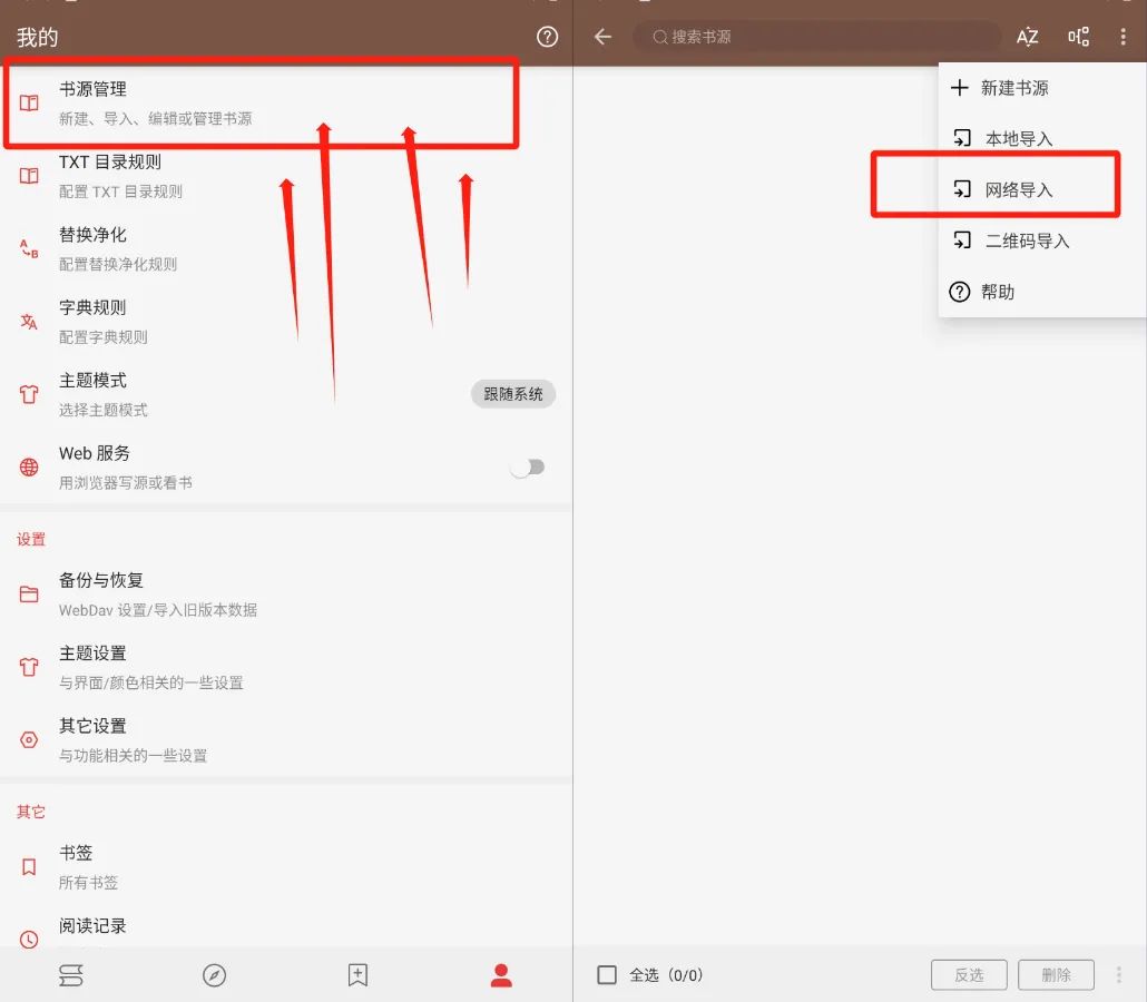 来到个人设置页面,选择【书源管理】,然后呢点击右上角三个小点,选择【网络导入】,会弹出输入框,我们把源的链接复制上去确定解析导入即可。