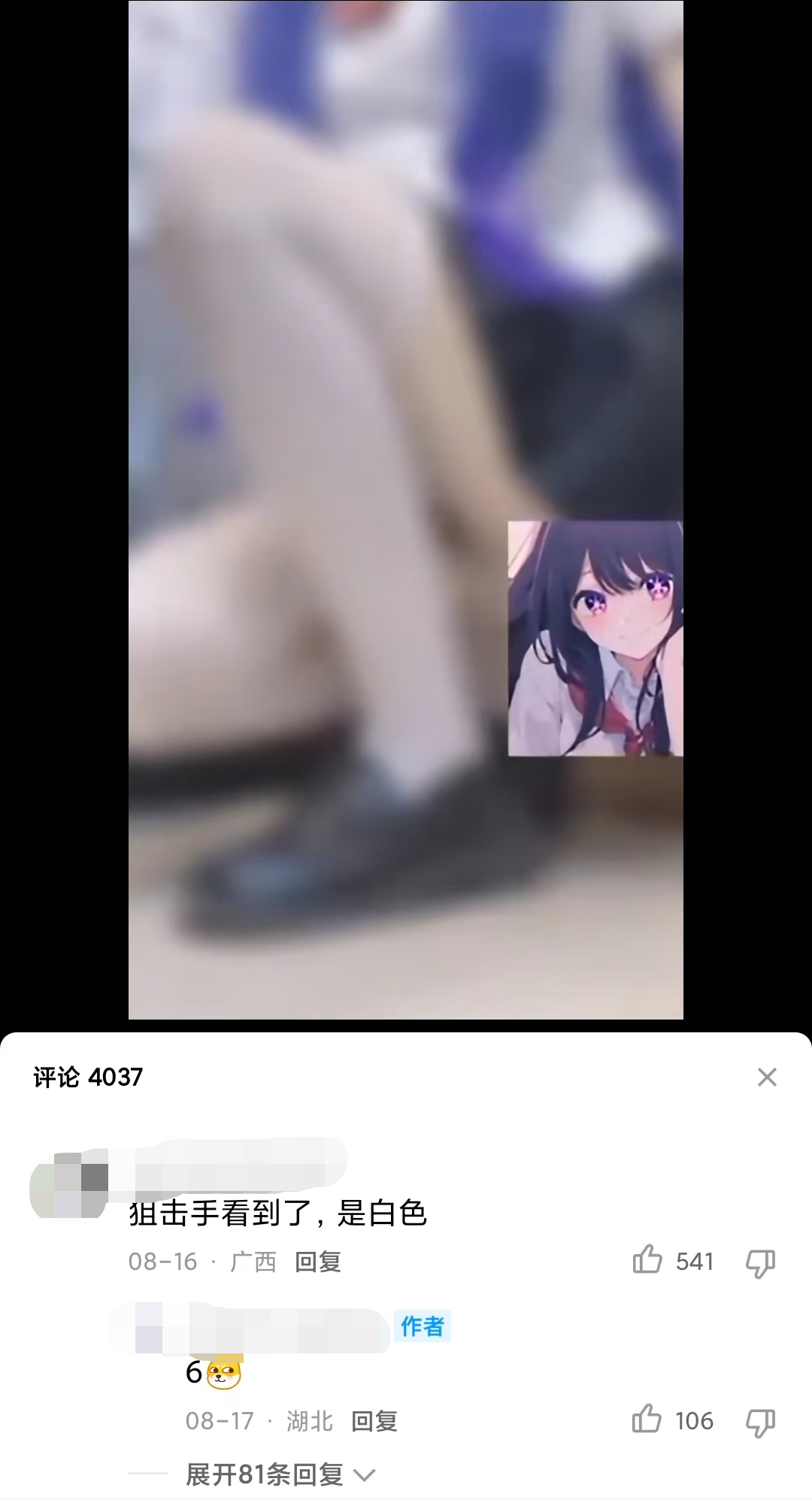 视频内,一位女生穿着短裙、丝袜,面对镜头下蹲。评论区有“狙击手”说看到了“白色”,视频作者回复“6”。
