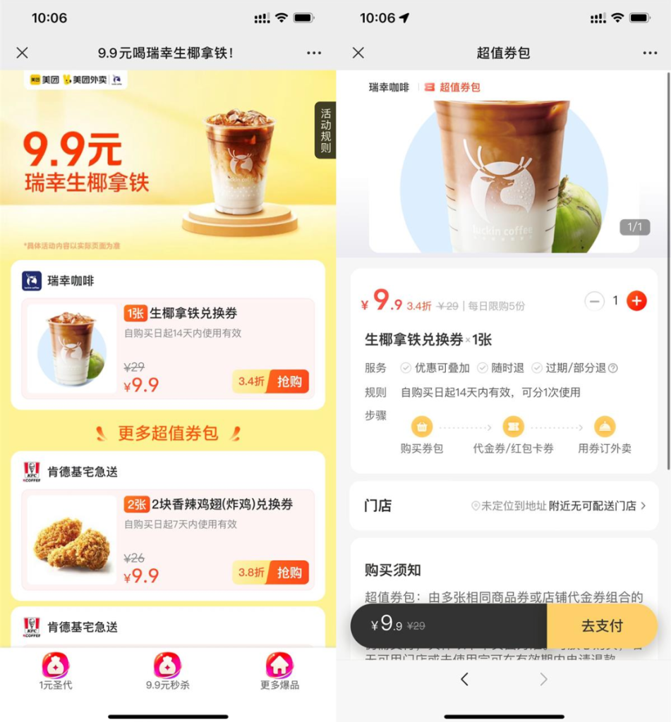 打开地址或美团扫码->9.9元购瑞幸生椰拿铁兑换券,券有效期14天 每日限购5张,喜欢喝瑞幸的可以屯几张