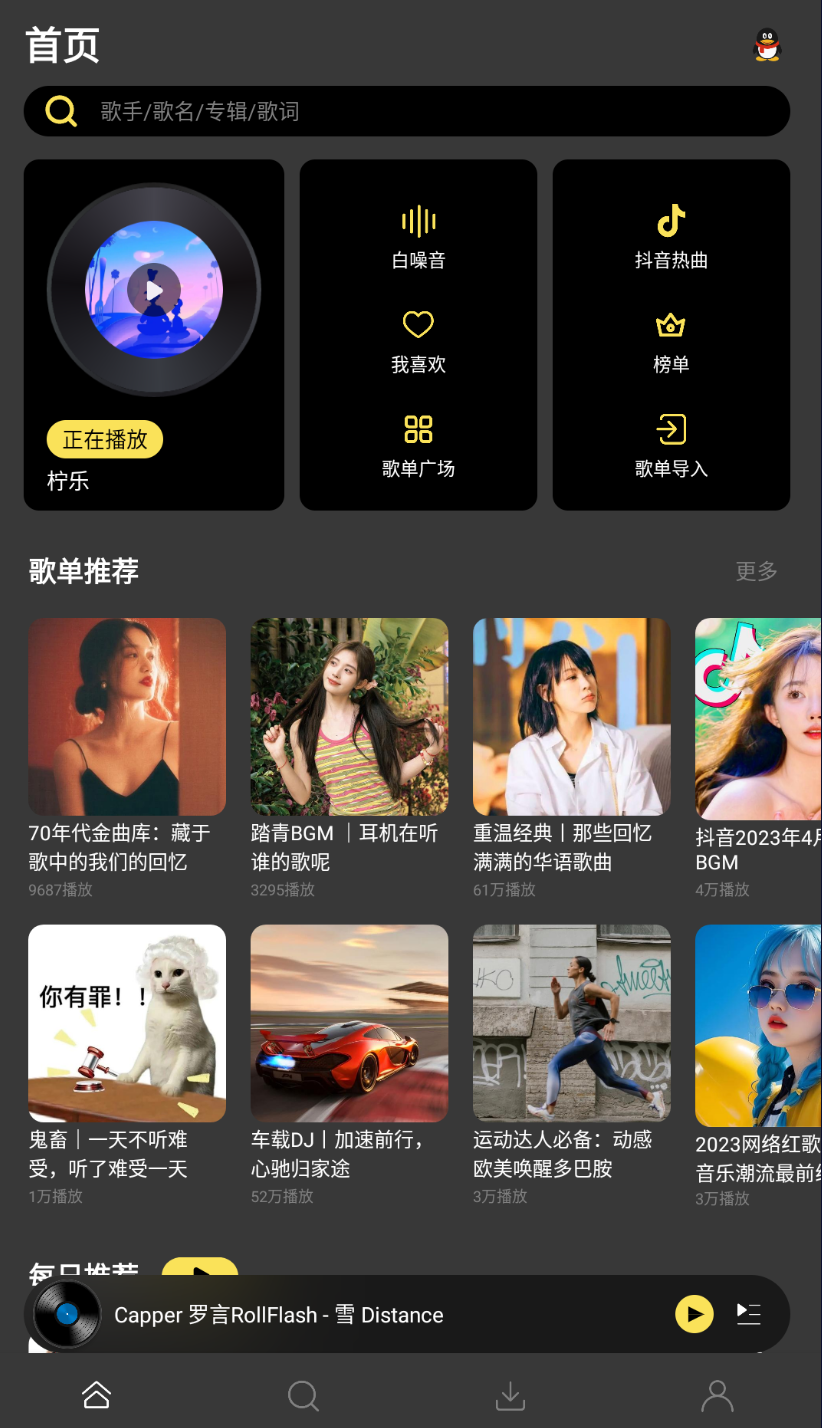 首先呢,软件的首页非常的干净整洁,整体是一个黑色系,而且目前呢长青是完全没有发现广告的首页聚合了各个音乐平台的榜单、歌单,包括抖音热榜、歌单推荐、每日推荐等,可以帮你轻松获取各种热门歌曲。