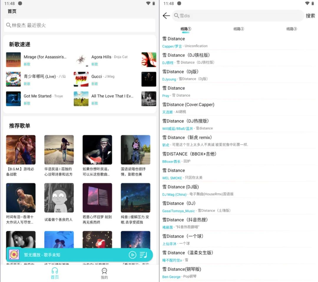 首页呢给我们推荐了一些不错的歌曲还有歌单目前软件内置了3条音源,我们在搜索的时候就可以看到