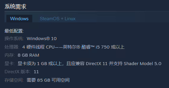 - 处理器:4 硬件线程 CPU—— 英特尔酷睿 i5 750 或以上