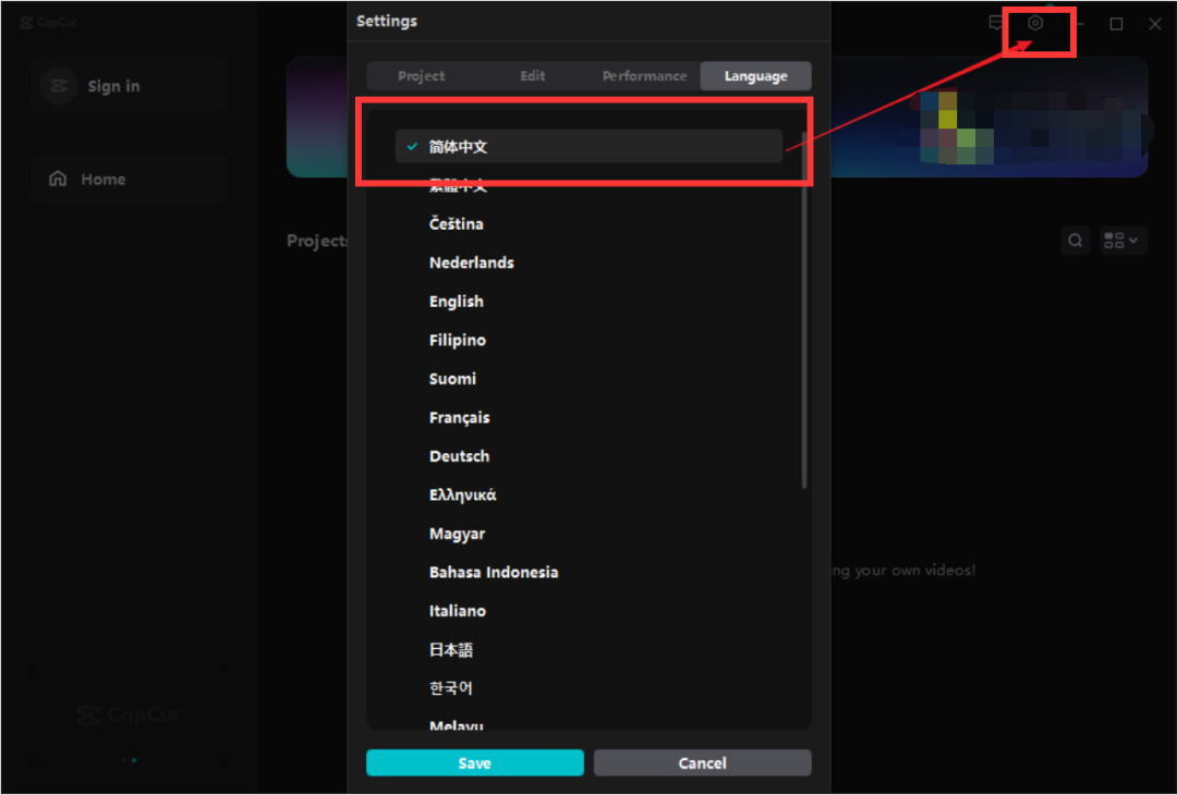 第一次使用剪映国际版的话,是需要在右上角设置找到语言,然后切换为简体中文,方便后续使用。