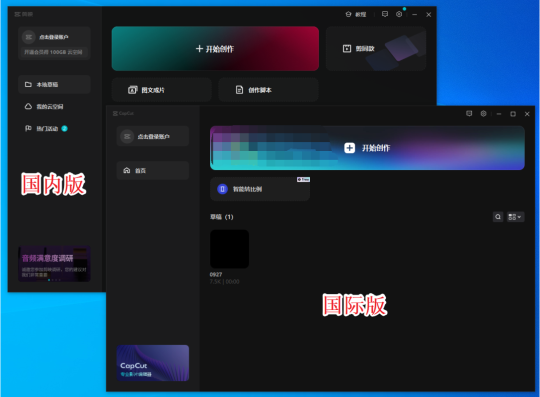 对比国内版的剪映呢我们可以看到,国际版的界面更加的干净简洁,没有任何花里胡哨的功能。