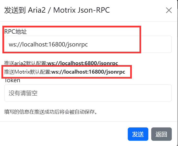 接下来我们需要填写【RPC地址】,我们把下面提供的motrix软件的prc配置直接复制到PRC地址输入框之中,token不需要填写,然后点击发送即可。