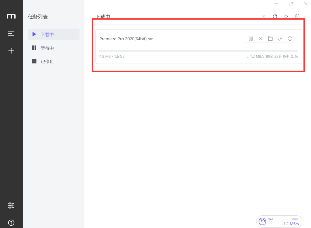 然后呢我们回到motrix软件中就可以看到文件已经开始下载了,因为长青这里网速不好,所以下载速度比较慢,但是也比官方的速度要好多了。
