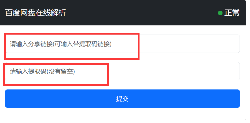 接下来我们来到网页版的解析页面,把度盘的链接密码复制到对应的输入框之中,然后点击【提交】解析。