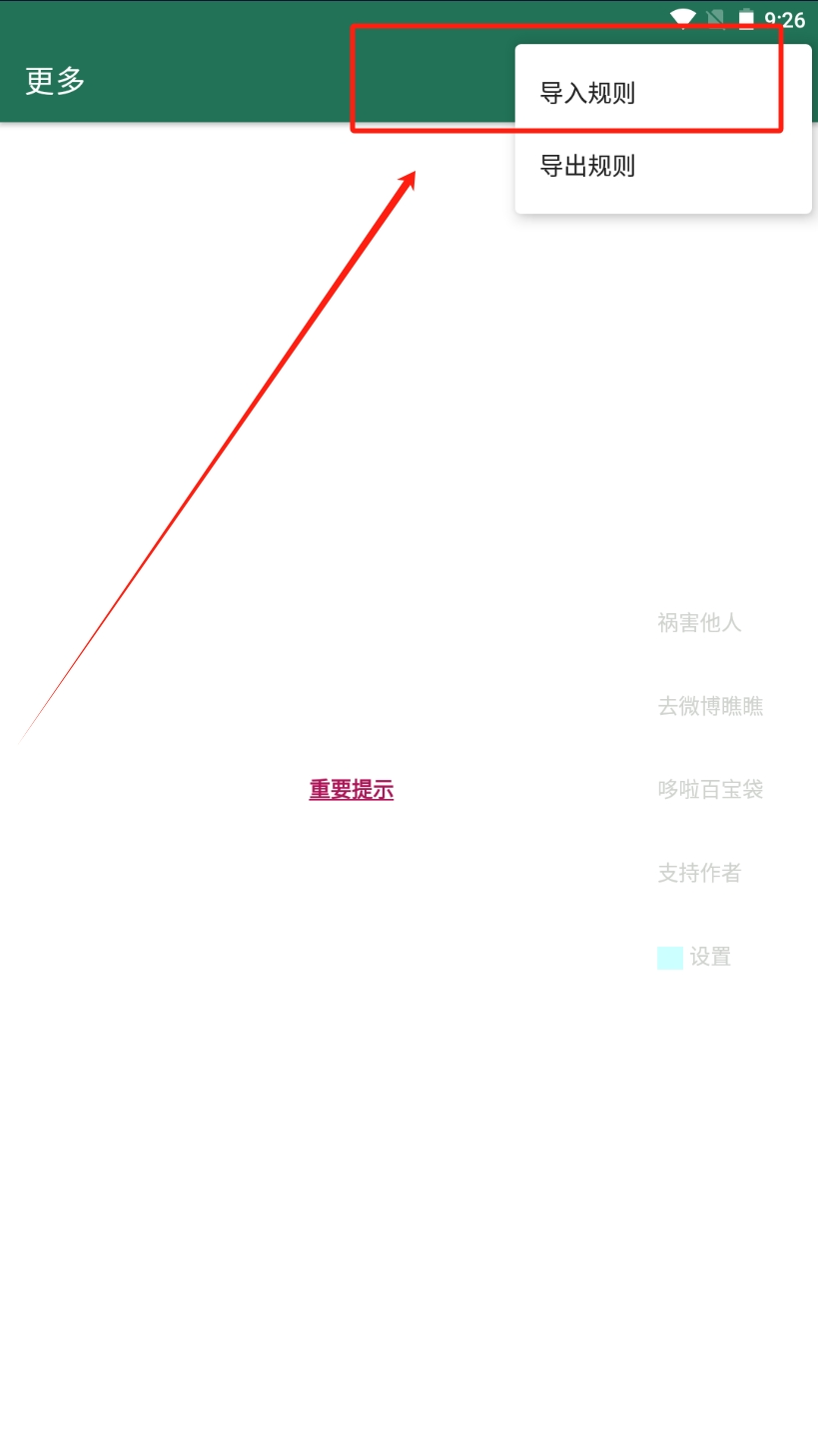 然后呢回到【更多】页面,右上角展开选择【导入规则】,把长青给大家提供好的规则导入即可。