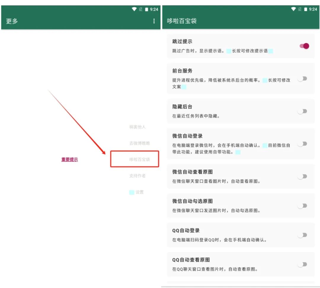 然后点击【百宝袋】,自行开启需要的设置。