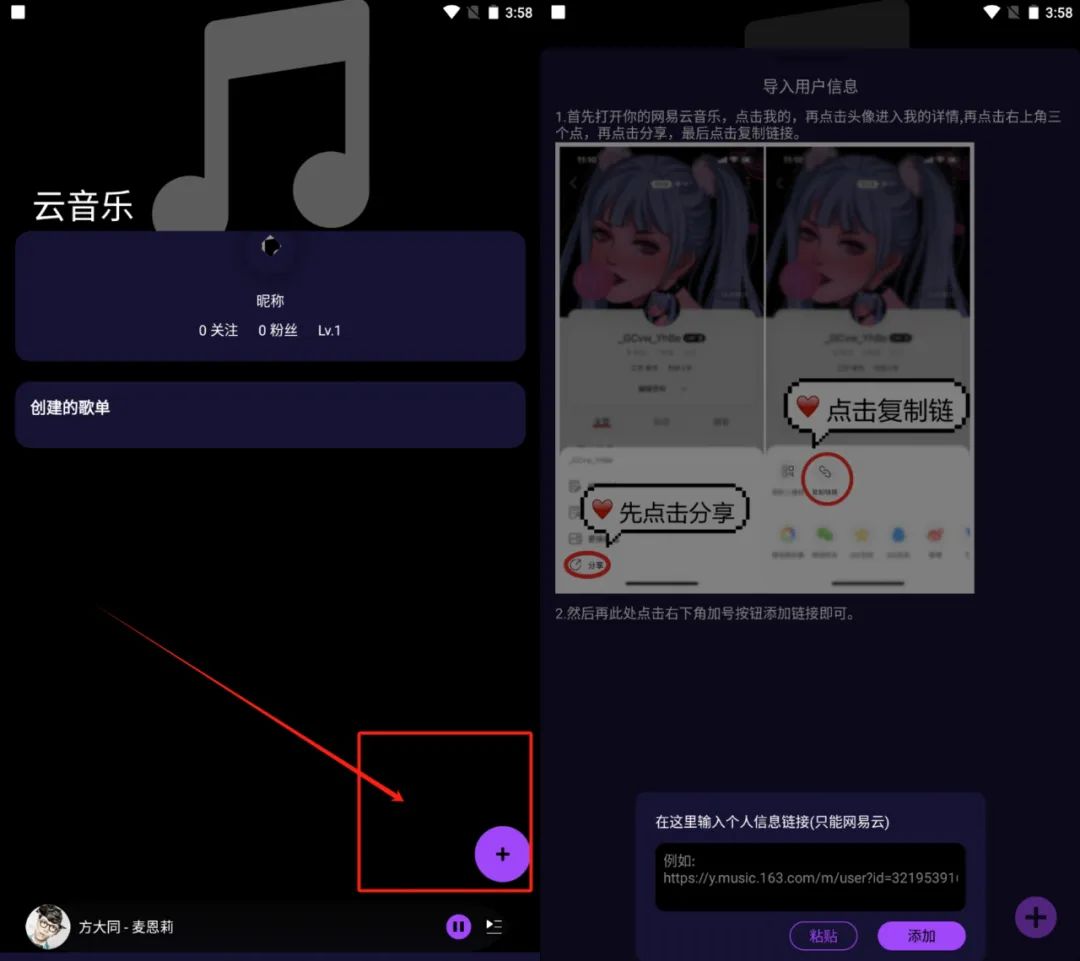 2、来到Fly音乐 – 个人中心 – 添加账号 – 右下角+号,然后粘贴网抑云的个人信息链接导入即可。