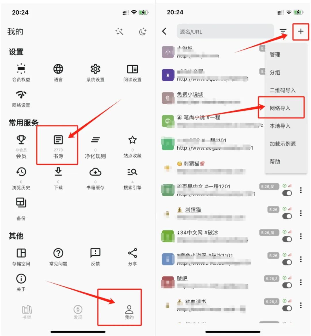 然后回到软件中,来到【个人中心】,点击【书源】进入书源管理页面,然后点击右上角展开选项,选择网络导入,把刚才复制的书源地址粘贴导入即可。