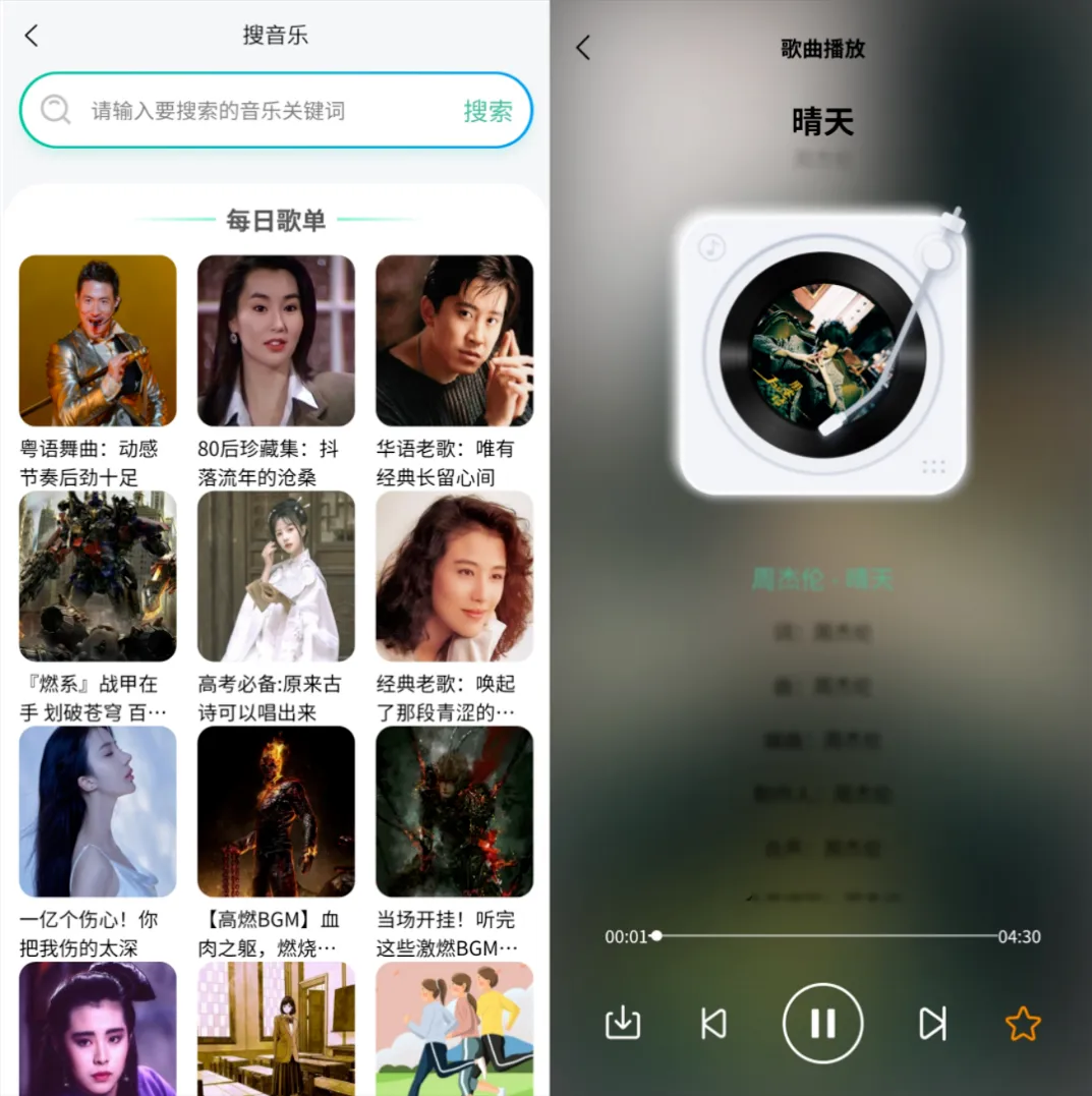 这边呢还有搜索音乐听歌的功能,我们想听什么歌曲可以直接搜索,资源的丰富程度不比某易云啥的少,而且呢还支持下载到本地。