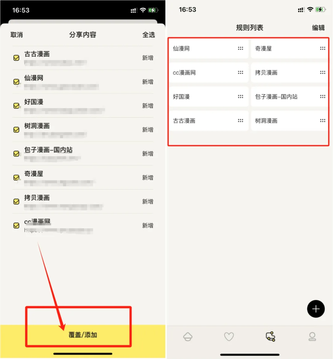 然后呢把官方给我们准备好的漫画源全选添加即可,可以看到像大家比较熟悉的拷贝漫画和包子漫画的资源也是,不过拷贝的资源可能要用科学上网才行。