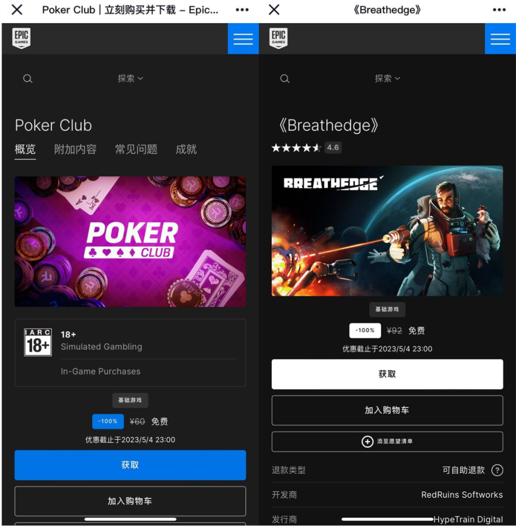 Epic喜+2 免费领取游戏《呼吸边缘》《扑克俱乐部》