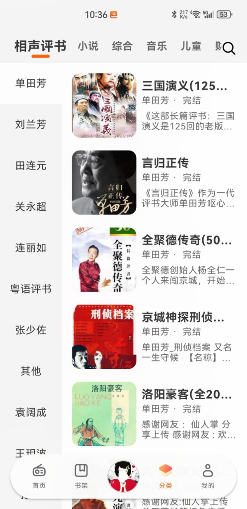 软件内置庞大书源库,涵盖了各种题材的作品,不仅有相声评书和有声书,还有脱口秀、电台、历史、校园等类型的内容。更有独家优质资源,囊括某雅和某懒的听书资源,全部免费听!