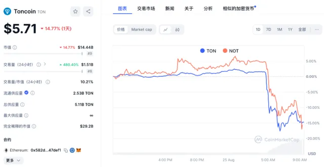 杜罗夫被捕消息传出后,与Telegram密切相关的加密代币Toncoin一度暴跌逾20%。