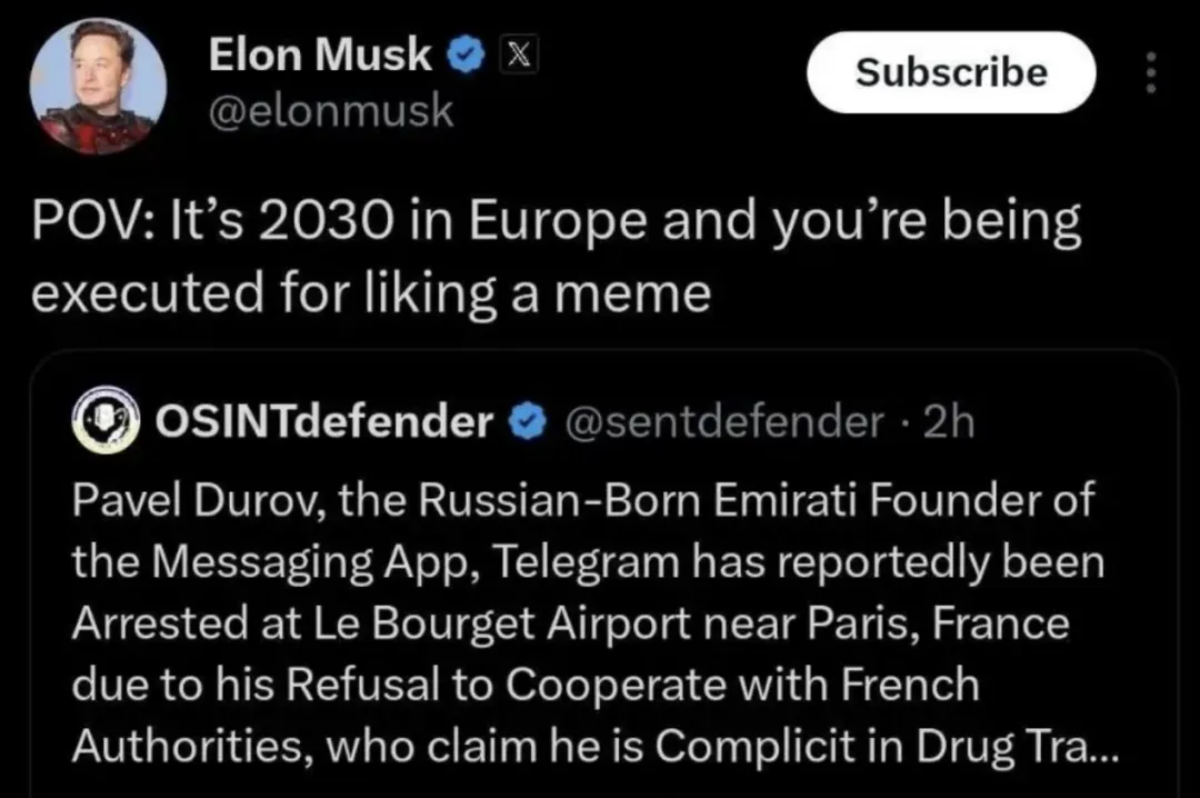而特斯拉CEO埃隆·马斯克表达了对此案件的强烈不满,他在社交平台上称:“观点:现在是2030年的欧洲,你因为喜欢一个模因而被处决!”