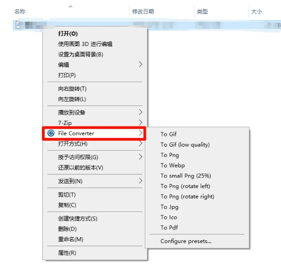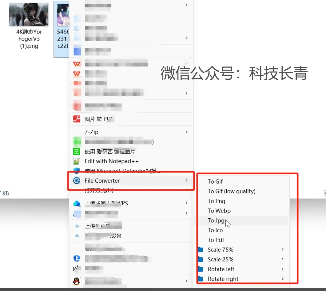 比如我们要把一个png格式的图片转换成其他格式,那就选择要转换的图片,鼠标右键找到FileConverter转换选项,选择你要转换的格式。