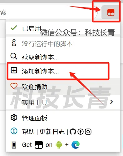然后点击浏览器上的篡改猴拓展,选择【添加新脚本】。