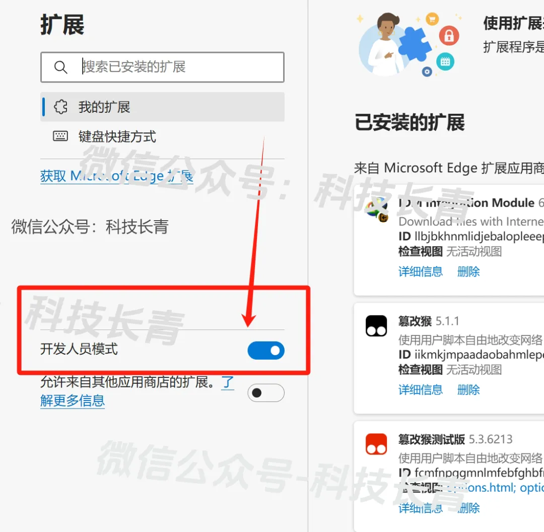 需要注意:我们在浏览器【拓展管理】这边一定要打开“开发者模式”,不打开的话脚本到时候没办法使用哦!!!