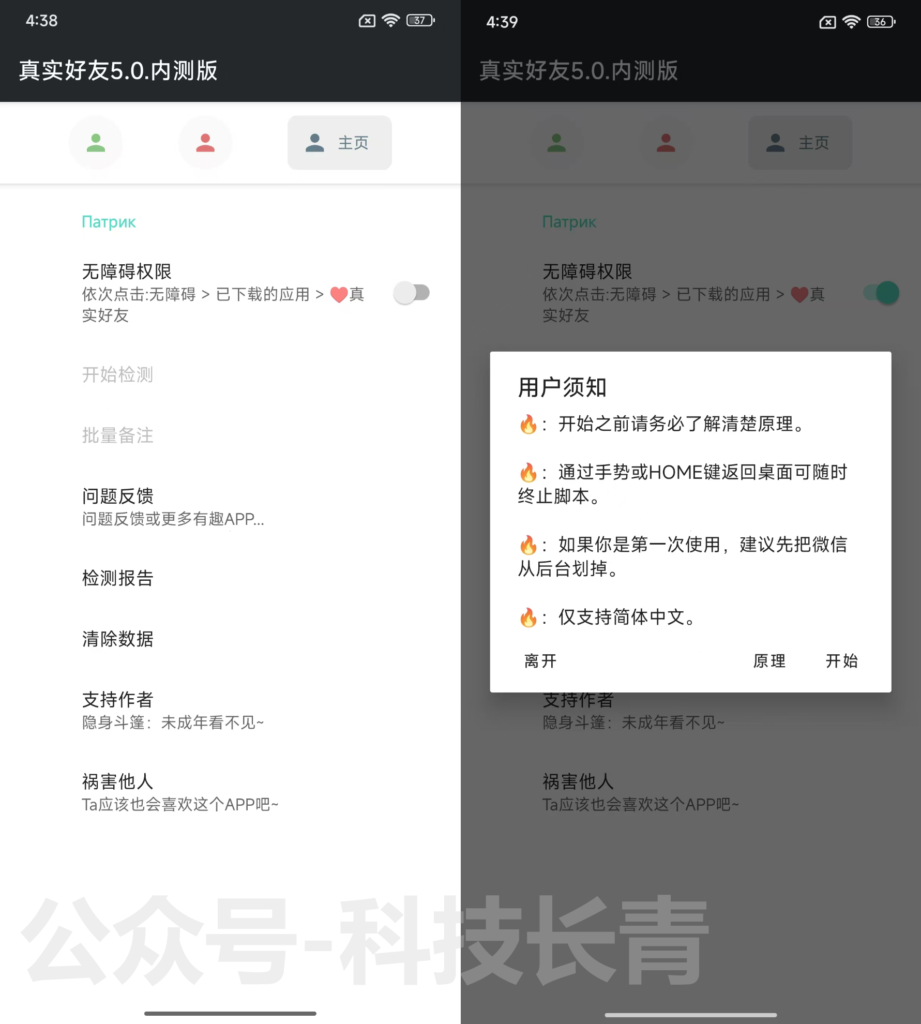 真实好友5.0app是一款可以检测微信好友是不是把我们删除拉黑的软件,可以在不影响微信好友的情况下查看真实好友情况,如果对方删除了我们,我们就可以直接删除对方,如果对方没有删除自己,那么还可以留下联系方式,真实好友5.0通过给好友转账的形式检测出来所有的微信好友关系,不需要用户操作,全程自动测试,只需要给予一定的手机权限即可