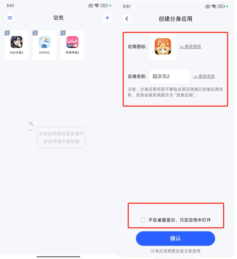 1、空壳是一款应用分身类应用。支持主流应用分身;围绕分身的应用为你打造另一个完整冲浪身份;让你的身份,由你做主。