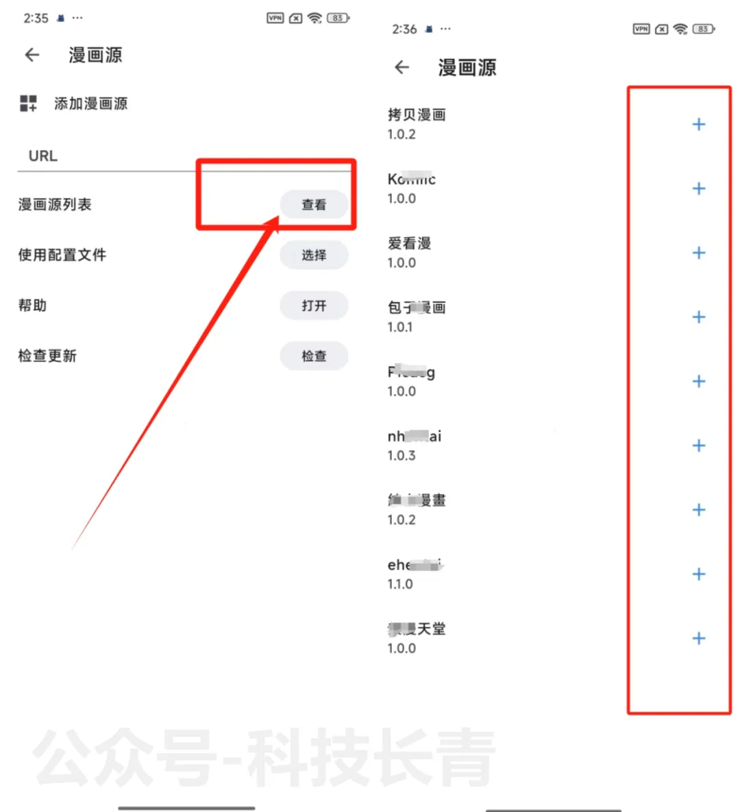 第一次使用需要导入漫画源,这边点击【查看】按钮,然后选择+号把需要的漫画源一个个添加即可。注意:软件需要使用魔法上网