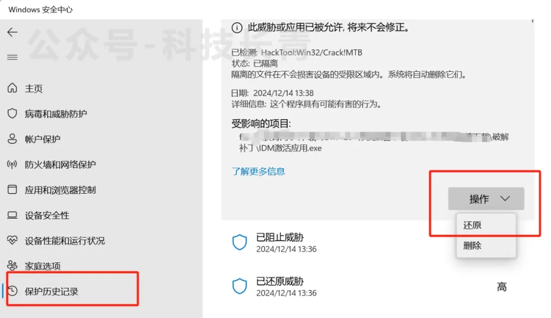 如果激活工具还是被杀掉了,我们可以在安全中心-保护历史记录,找到这个程序,还原或者允许运行即可。