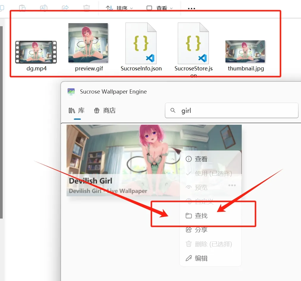 我们可以右键壁纸,选择『查找』就可以打开壁纸所在的目录。