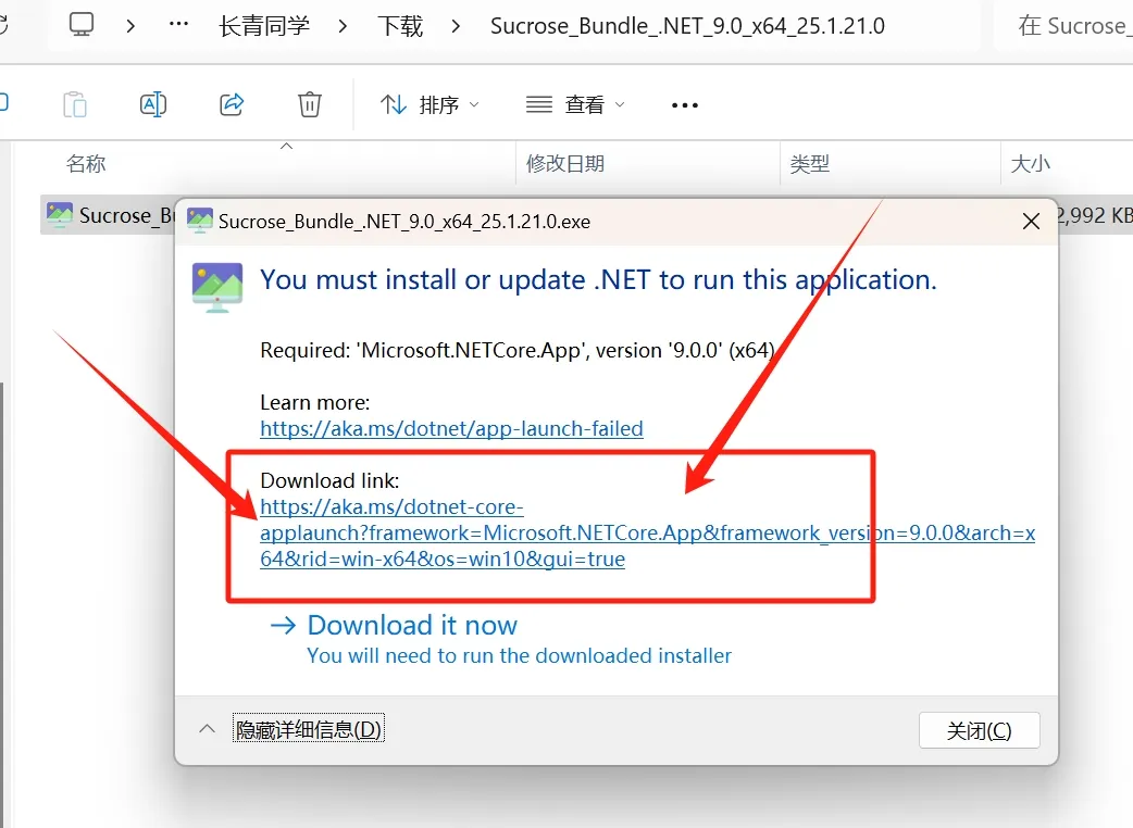 软件依赖于NET9.0组件,如果你的电脑没安装,会弹出下面的提示,我们直接点击DownloadLink链接跳转下载。